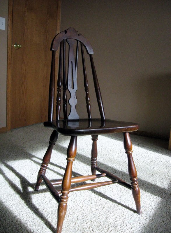The secretary came from my husband's aunt and I had always planned to use it as a desk for my computer but I knew I had to find a chair for it. Days after we move here I went into town and found a second-hand store crammed full of stuff piled on top of other stuff. I wandered around trying to take it all in when I noticed a wooden kitchen chair almost hidden under a pile of someone else's treasures. I cleared chair off and looked it over. It was beautiful.