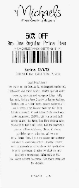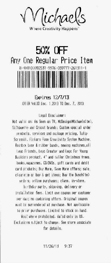 Not valid on: As Seen on TV, MiDesign@Miichaels(tm), Silhouette and Cricut brands; Custom special order product, services and package pricing, Tulip Screenil, Fiskars Fuse Creativity System Machine, Rainbow Look & rubber bands, sewing machines, all Lego Friends, Lego Creator and Lego For Young Builders Product, 4' and taller Christmas Trees, books, magazines, CD/DVDs, gift cards and debit card products; Buy More, Save More offers; sale, clearance or buy & get item; Buy the Bunch(tm) orders; online purchases' class, in-store, birthday party, shipping, delivery, or installatior (sp) fees. Limit one coupon per customer per day; no combining offers. Original coupon must be surrendered at purchase. Not applicable to prior purchases. Limited to stock on hand.